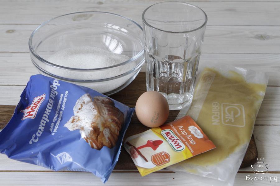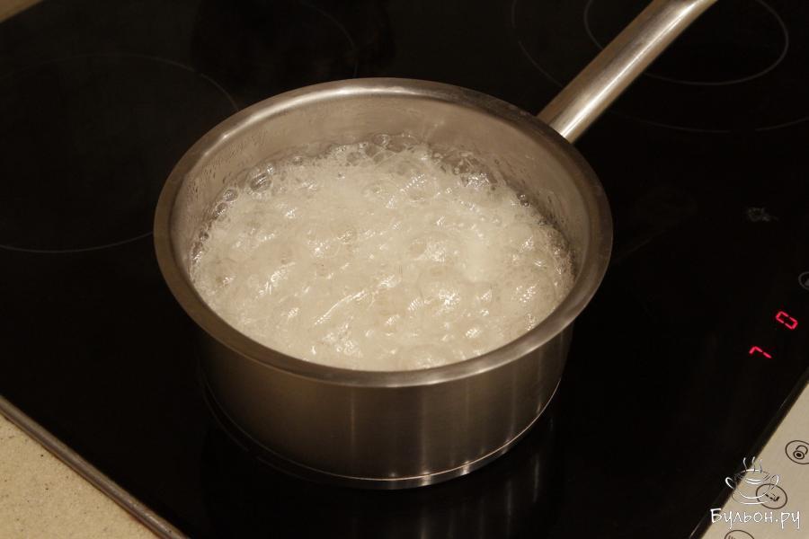 4. Пока белок и пюре взбивается, начинаем варить сироп. В сотейник с толстым дном влить воду и всыпать агар-агар. Довести до кипения.