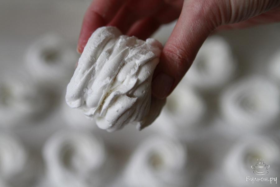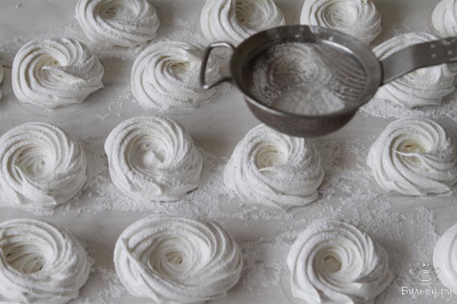 9. Быстро отсадить зефир и оставить его на столе на 20-24 часа. Корочка зефира должна подсохнуть. Только когда корочка подсохнет присыпать половинки зефира сахарной пудрой.