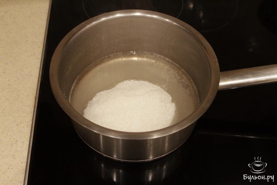 6. Варить сироп на среднем огне, регулярно помешивая. Сироп будет бурлить и на поверхности появятся большие белые пузыри. Уваривать сироп до 110 градусов. Потребуется около 5 минут после добавления сахара.0