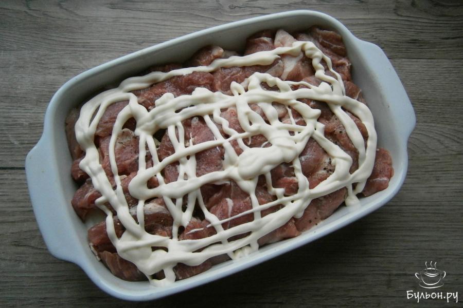 3. Свинину порезать плоскими кусками и выложить его сверху, обязательно посолить и также, поперчить.