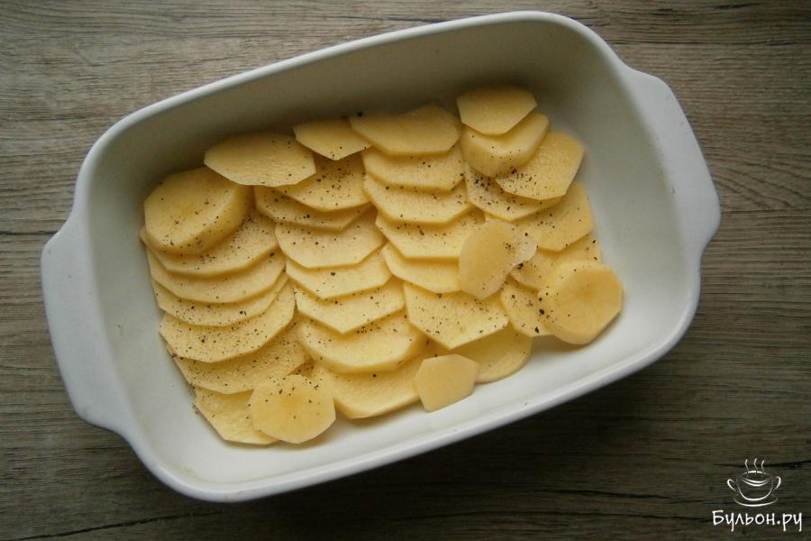 1. Форму д. 22-24 см или обычный противень смазать любым растительным маслом. Картошку порезать достаточно тонкими кружками и выложить их по всему дну формы. Посолить картошку и посыпать черным перцем.