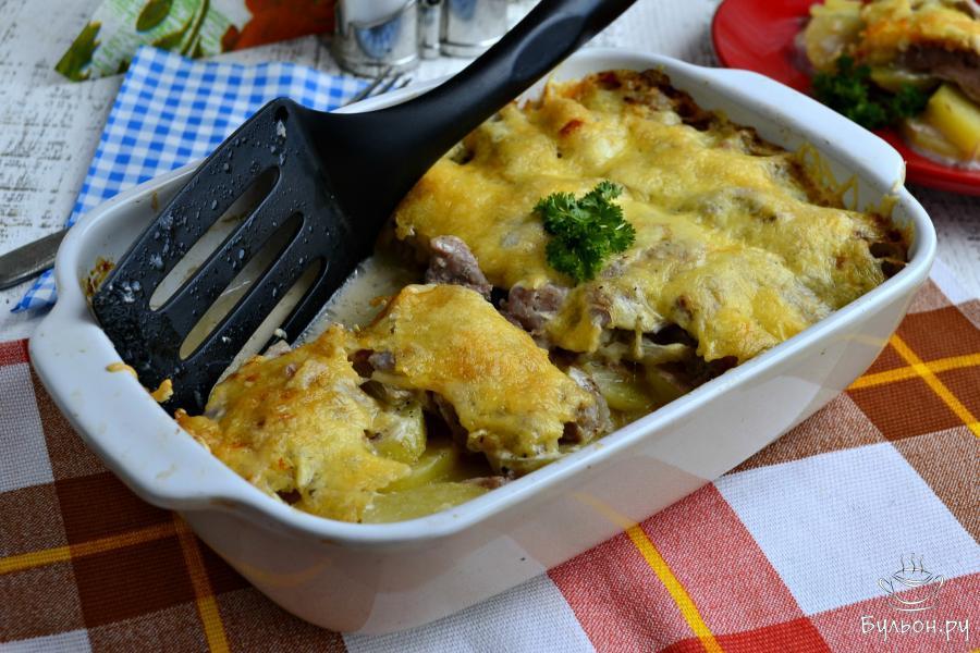 Мясо, приготовленное по-французски с мясом свинины и картошкой - это вкуснейшее полноценное блюдо, которое можно подать и на ужин, и в качестве основного блюда - на праздничный стол. Нежнейшее мясо, ароматный, пропитанный мясным соком и специями картофель и вкуснейшая сырная корочка сверху - ну что может быть лучше. Попробуйте этот вариант приготовления, по-моему мнению, он самый удачный. Мясо для этого блюда лучше взять из шейной части или использовать обычную мякоть. Обязательно приготовьте, вам, вашим близким и гостям блюдо понравится однозначно.