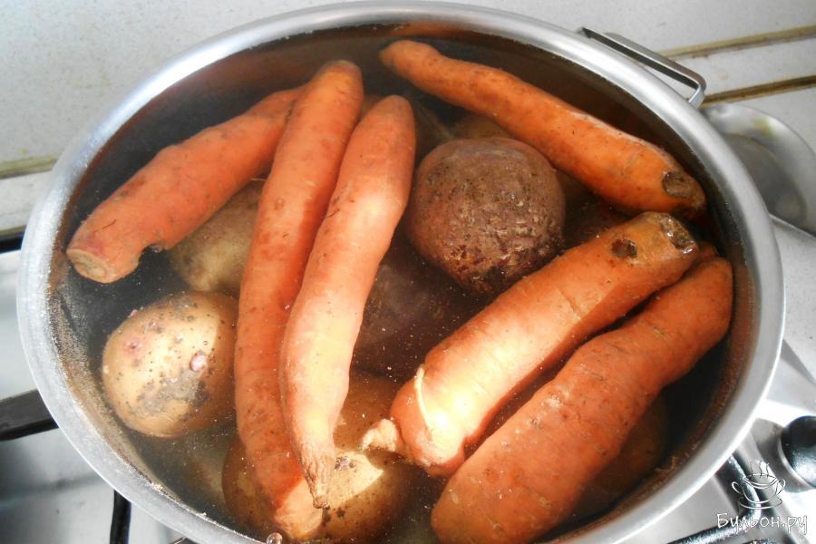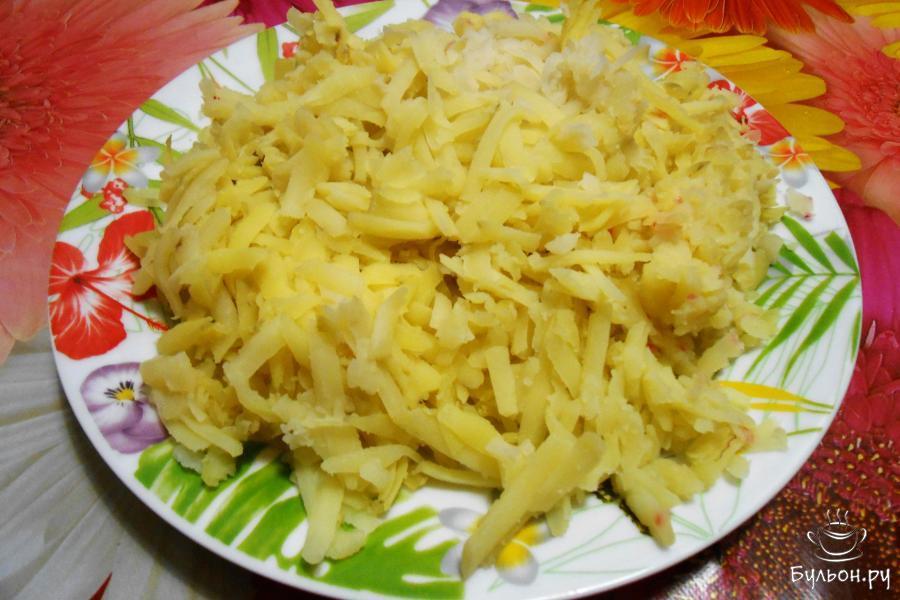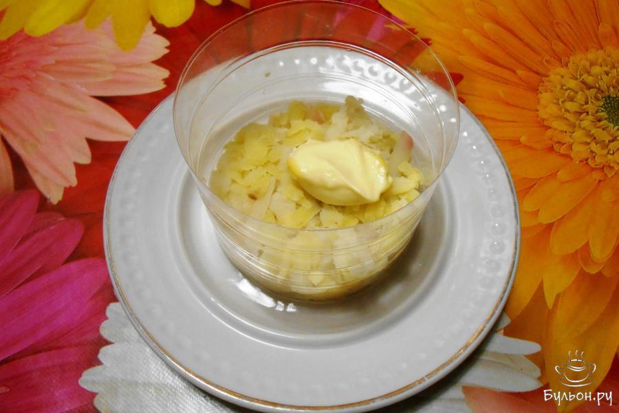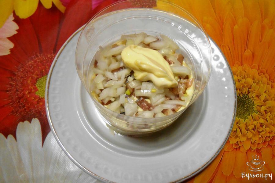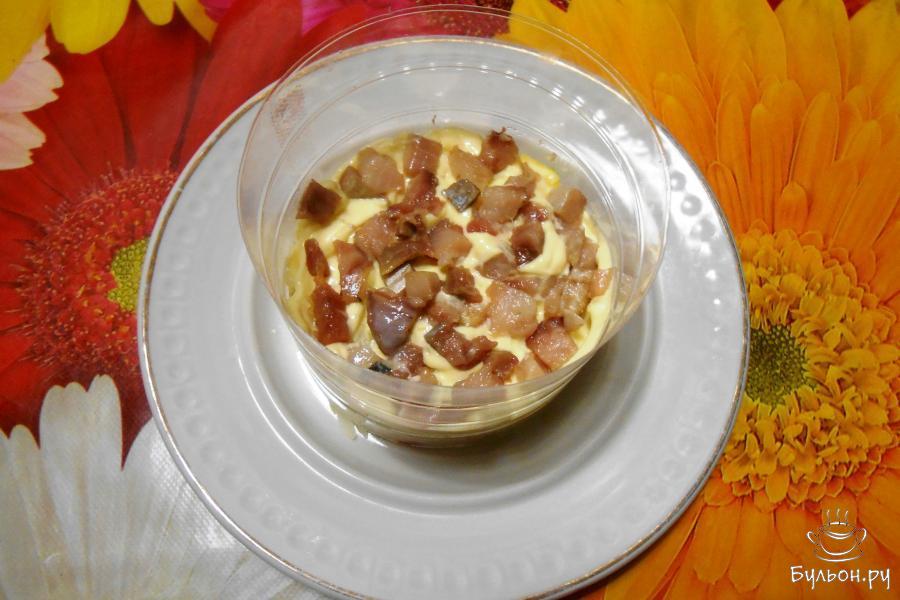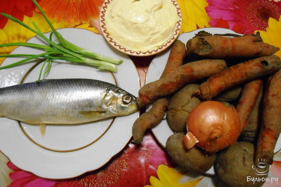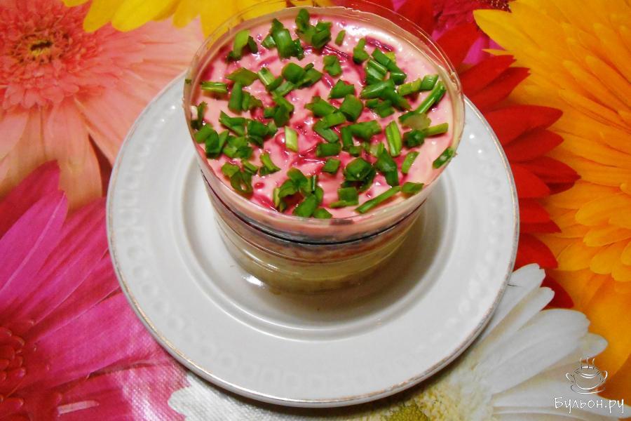 Классический рецепт всеми известного слоеного салата "Селедка под шубой" со свеклой и картошкой без добавления яиц. По моему рецепту вниз укладываем картошку, так селедка не будет отваливаться от нижнего слоя и, по-моему, так вкуснее. Если нет кулинарного кольца для порционной подачи, можно обрезать пластиковую бутылку. Для салата я использую домашний майонез. Лучше готовить салат заранее и дать настояться в холодильнике ночь. Из указаного количества ингредиентов получается 7 порций.