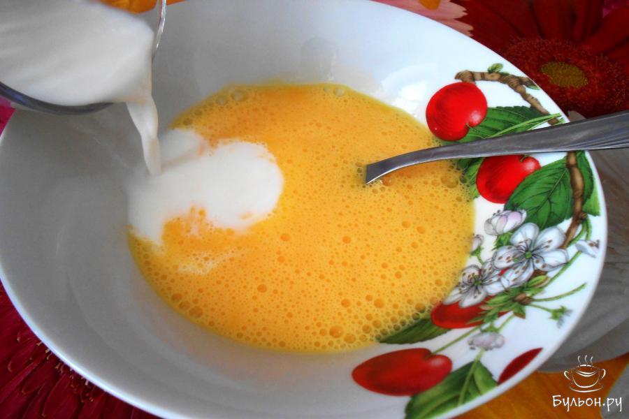 7. Сразу после начала схватывания яиц - нужно начать помешивать деревянной лопаткой с 10 секундным интервалом до образования отдельных кусочков. Убрать с огня, как только все кусочки схватились.
