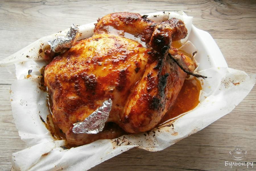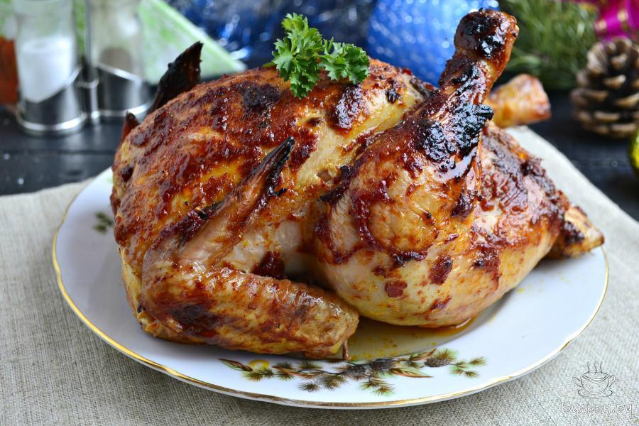 13. Снова поместить курочку в духовку и запекать далее еще 30-40 мин. - она должна стать очень красивого румяного цвета. Периодически курицу следует поливать выделившимся мясным соком.