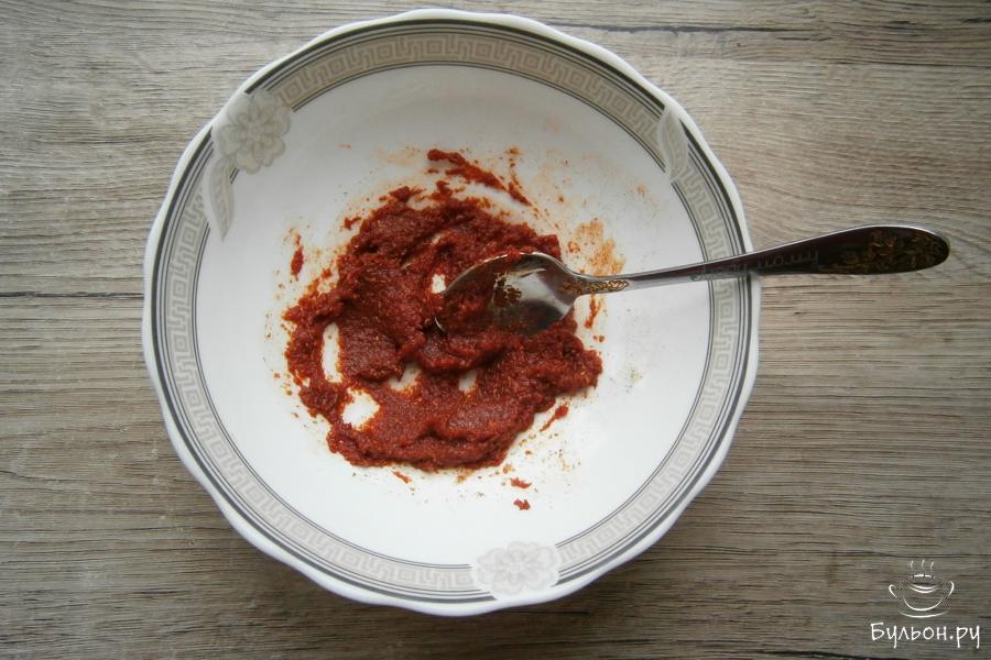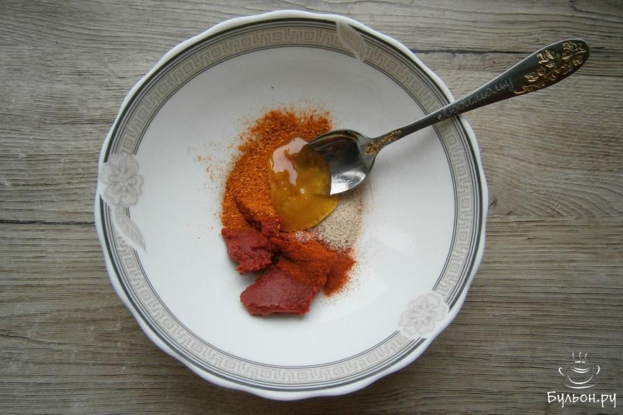 7. Приготовить намазку для курицы: к томатной пасте добавить мед, паприку, приправу для курицы, сушеный чеснок, смешанный с небольшим количеством черного перца.