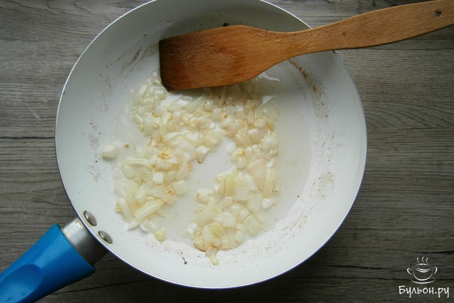 2. Лук порезать кусочками и обжарить, влив в сковороду 3 ст. л. растительного масла до легкой золотистости.