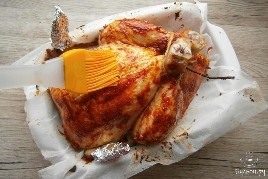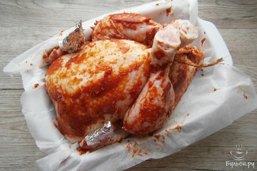 11. Курицу щедро смазать подготовленной намазкой со всех сторон, ножки связать бичевкой, кончики крыльев закрыть фольгой. Курицу разместить на противне или в подходящей по размеру форме, застеленной пергаментом.