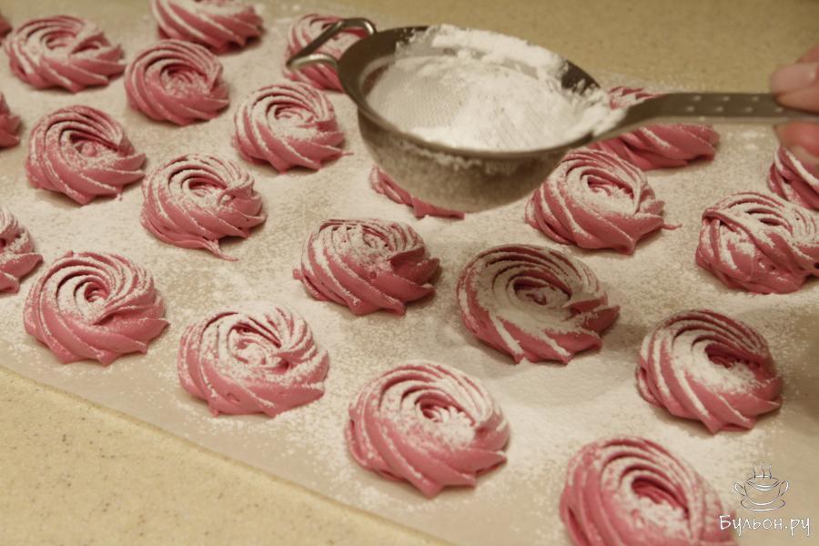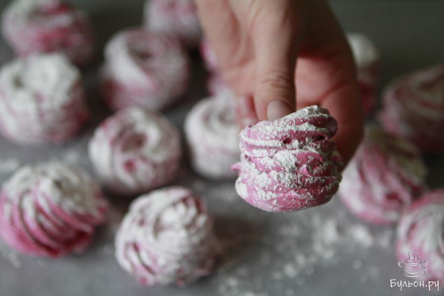 11. Для стабилизации зефира необходимо время. Как показывает практика, если выполнить все условия, то зефир готов уже через 4-5 часов. Я же его оставляю на 10-15 часов. Готовый зефир присыпать сахарной пудрой.