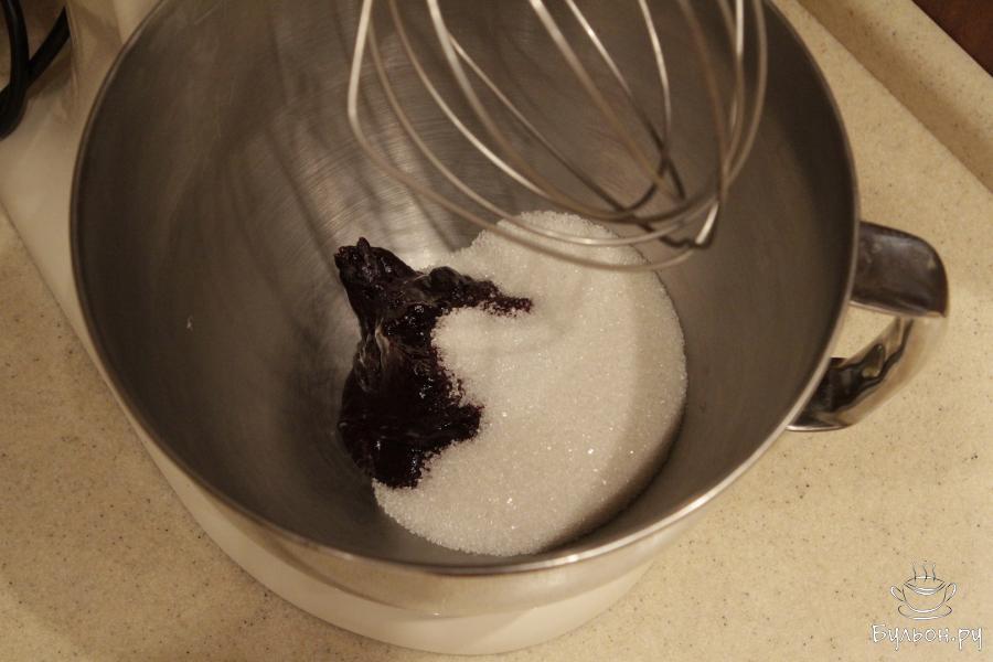 4. В чашу миксера переложить 150 грамм готового пюре, 130 грамм сахара и один белок комнатной температуры.