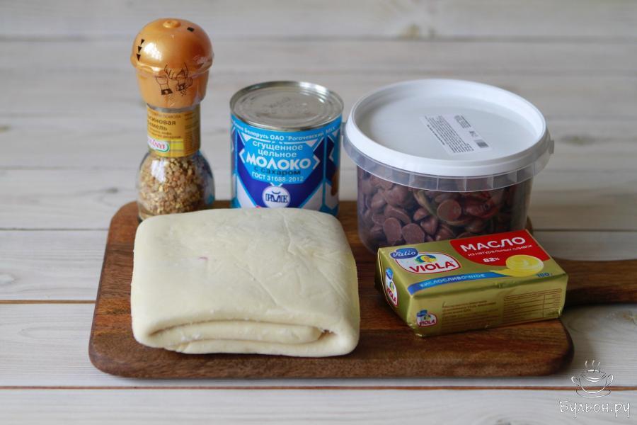 1. Подготовить все ингредиенты по списку. Слоеное тесто можно использовать покупное или приготовить заранее. Рецепт домашнего слоеного теста можно найти на этом сайте.