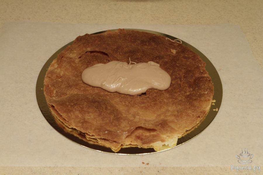 8. Самый центр подложки для торта смазать слегка кремом и выложить первый корж. Корж обильно смазать кремом.