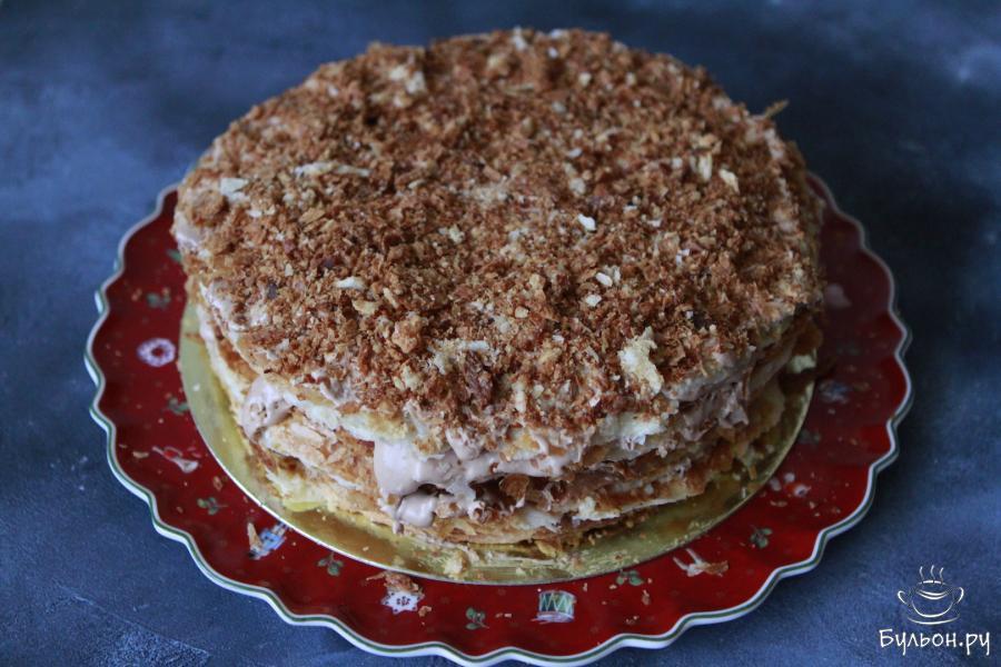 9. Таким образом собрать весь торт. Украсить крошкой от лишних кусочков теста или разломать в крошку неприглядный корж. Украсить Наполеон из домашнего слоеного теста на свой вкус и отправить его в холодильник минимум на 4 часа. В идеале, на ночь.