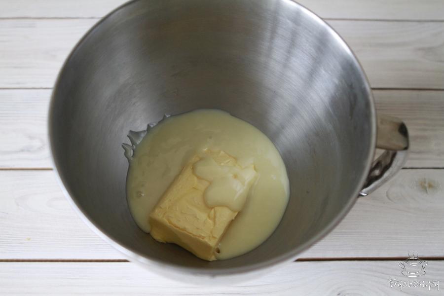 5. Для приготовления крема в чашу миксера переложить сливочное масло комнатной температуры и сгущенное молоко. Взбить на максимальной скорости 3-5 минут.