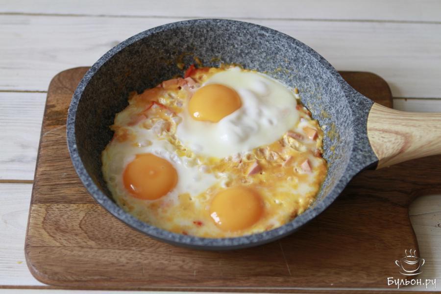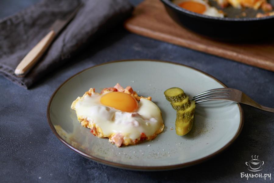 6. Яичница с помидорами и колбасой готова. Подавать ее лучше сразу. Для вкусовых ощущений можно подать такой завтрак с маринованными огурчиками. Приятного Вам аппетита.