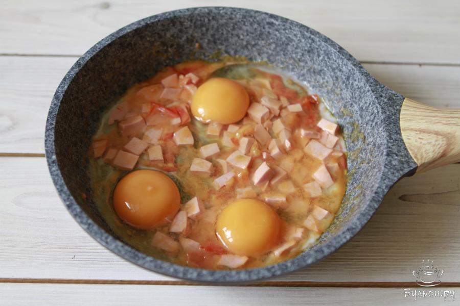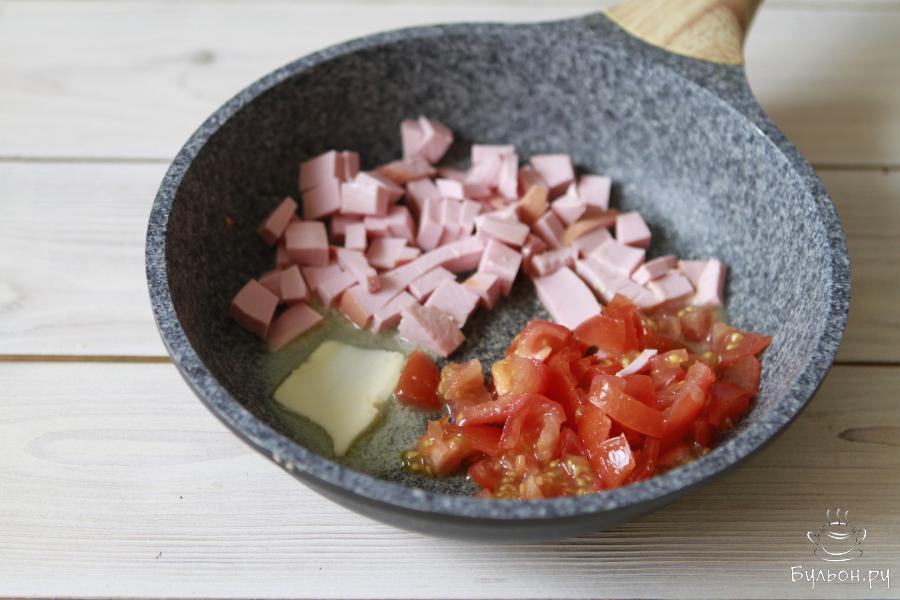 3. Обжарить колбасу и помидоры на масле. Я обычно обжариваю на сливочном, но его смело можно заменить на растительное или оливковое. Здесь дело вкуса.