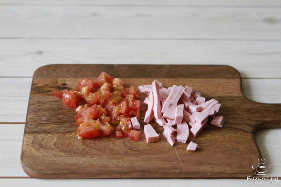 2. Колбасу и помидоры нарезать на кубики или брусочки небольшого размера. Здесь форма не особо играет роль, но желательно не очень крупно.