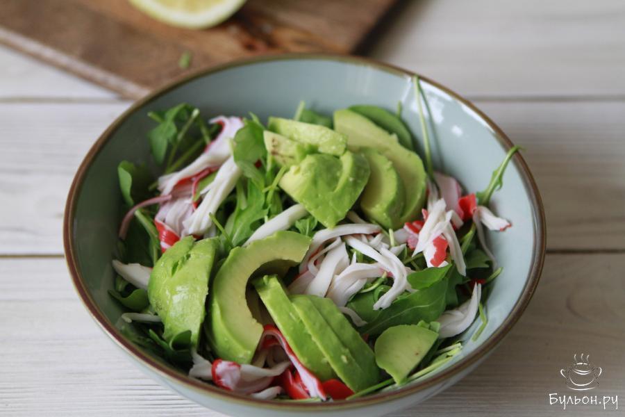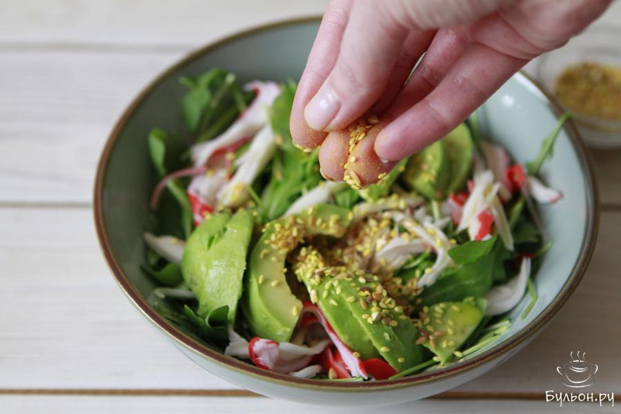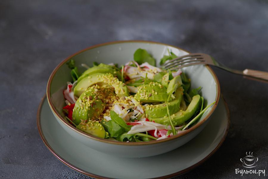 Предлагаю вам пополнить список рецептов легких, быстрых и очень вкусных салатов, и приготовить салат из авокадо и крабового мяса. Готовится он буквально за пару минут. Мясо краба великолепно сочетается с авокадо. Тут, пожалуй, сразу возникнет вопрос, можно ли его заменить на крабовые палочки. Теоретически, да. Отличие лишь в том, что крабовое мясо лучше разделывать руками, а крабовые палочки нарезать. Семена льна и кунжута добавляются по желанию. Их можно заменить на любую зелень или травы. Салат вкусный, и смотрится ярко, поэтому его вполне можно приготовить для праздничного застолья.