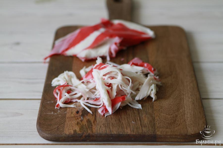 2. Крабовое мясо разделить на небольшие кусочки, точнее волокна. Сделать это можно руками или порезать ножом.