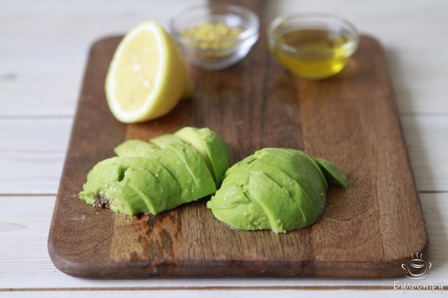 4. Удобным для вас способом разрезать авокадо пополам. Я обычно не чищу авокадо, разрезаю посередине, удаляю косточку, а мякоть достаю ложкой. Авокадо нарезать дольками. Сбрызнуть лимонным соком.