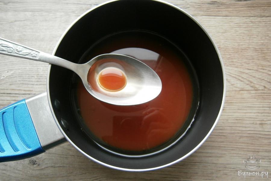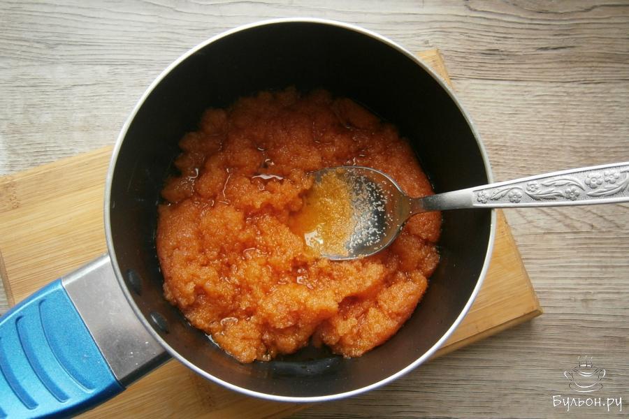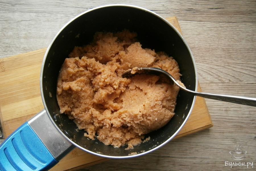 4. Томатный сок с маслом довести до кипения, огонь выставить на минимум. Тоненькой струйкой всыпать манку, постоянно помешивая и варить все до загустения. Манка начнет отставать от стенок ковшика - она готова. Дать манке остыть до теплого состояния.