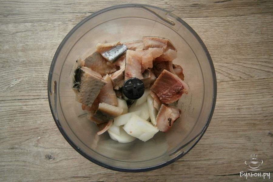 2. Отделить у селедки филе, убрав все кости, порезать на части и поместить в чашу блендера с кусочками лука.