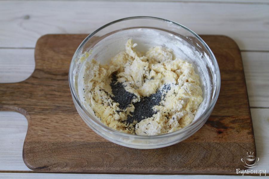 5. Все хорошо перемешать, добавить сухой мак и остатки муки. Замесить тесто. Тесто не должно быть тугим, но и не должно прилипать к рукам.