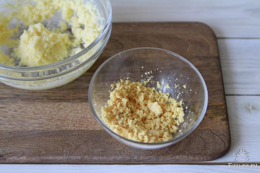 1. За час до приготовления достать сливочное масло из холодильника. Сливочное масло взбить с сахаром в пышную пену.
