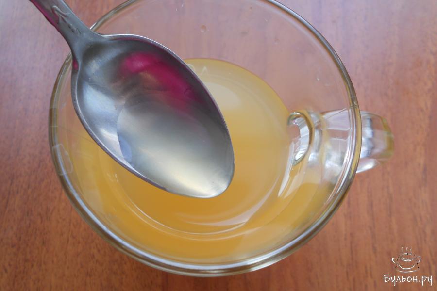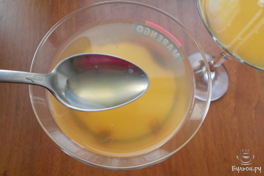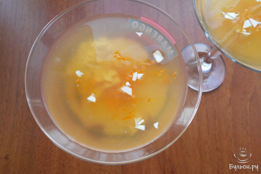 7. Сверху в сок добавить цедру апельсина и посыпать тертым белым шоколадом. У меня - осколки шоколада, большая часть их погрузилась на сгущенку, если шоколад потереть, он будет сверху сока.