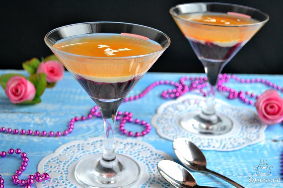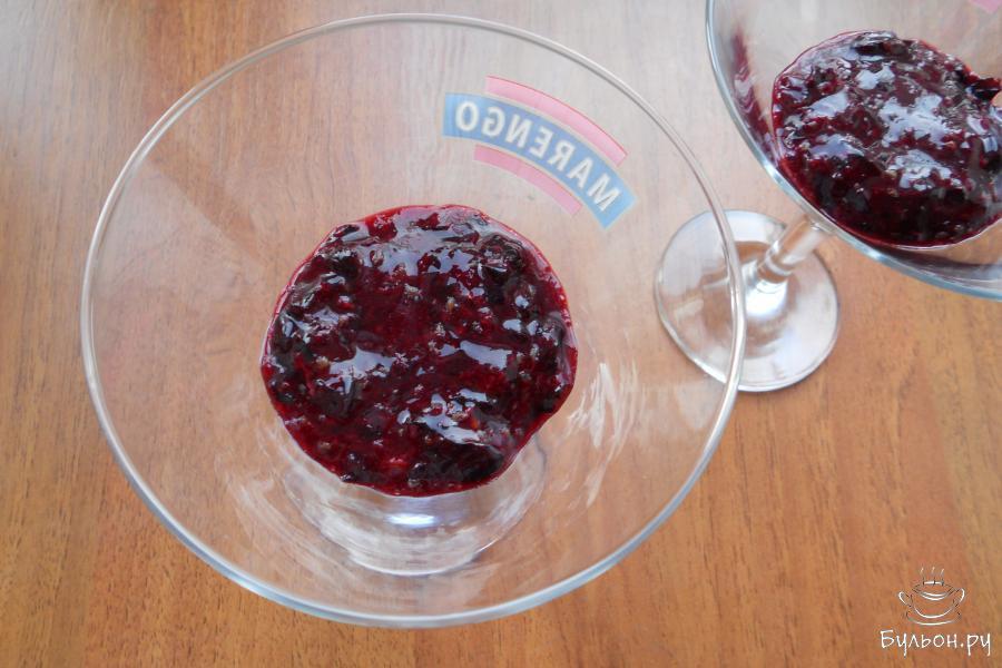 3. Смородиновое пюре разложить на дно бокалов. Отлично смотрится этот напиток-десерт в бокалах для мартини.