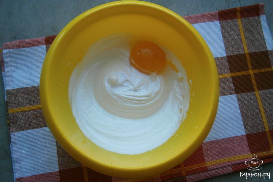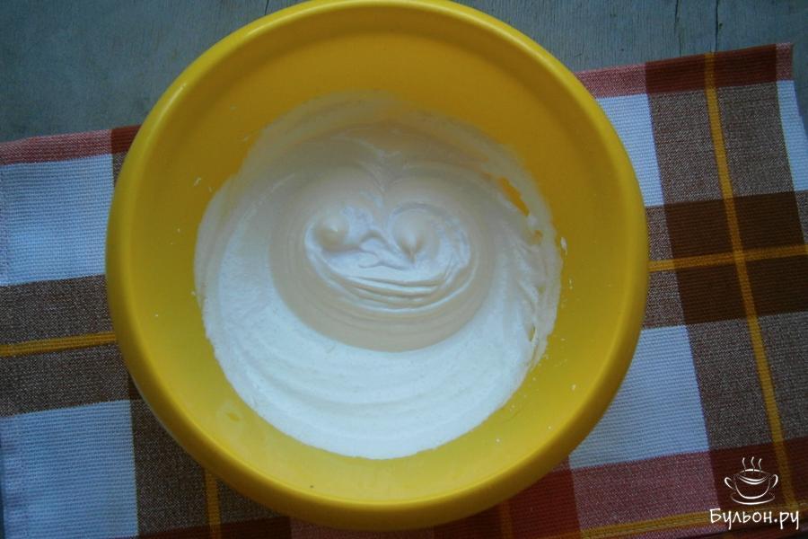 1. Яйцо разделить на белок и желток. Белок взбить со щепоткой мелкой соли миксером до пены, затем, всыпать частями сахар и продолжать взбивание до крепких пиков.