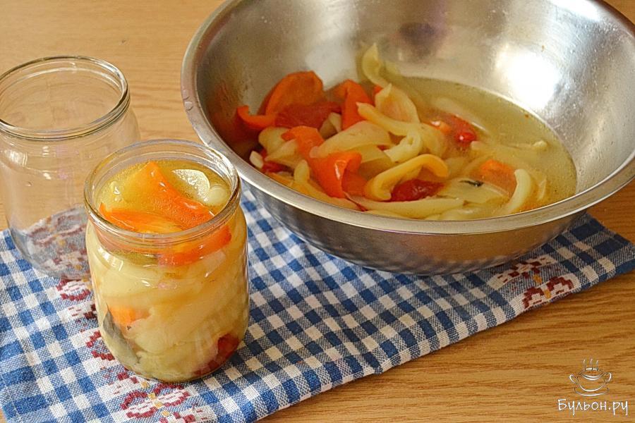 7. Пока перец варится, можно успеть приготовить банки - вымыть их и простерилизовать вместе с крышками. Горячую массу сразу же разложить по баночкам и укупорить крышками. Перевернуть до полного охлаждения банок.