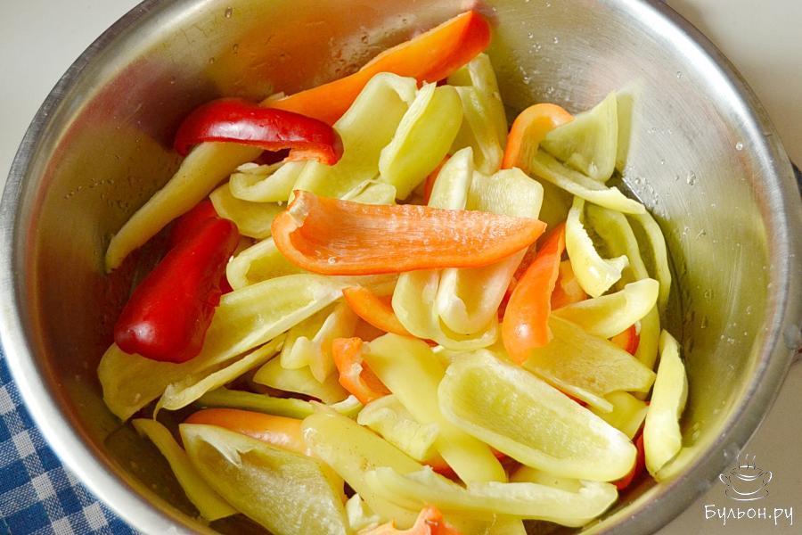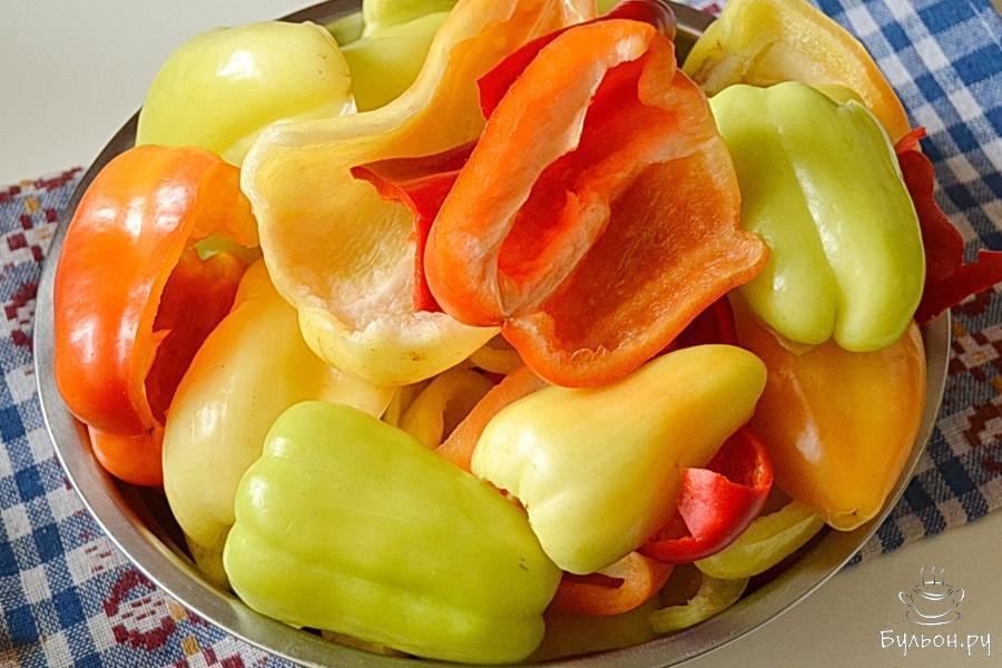 3. Далее каждую перчинку нарезать дольками (примерно на 6-8 частей в зависимсти от размера). Использовать можно перчик разных цветов, тогда плоды будут красиво смотреться в банке.