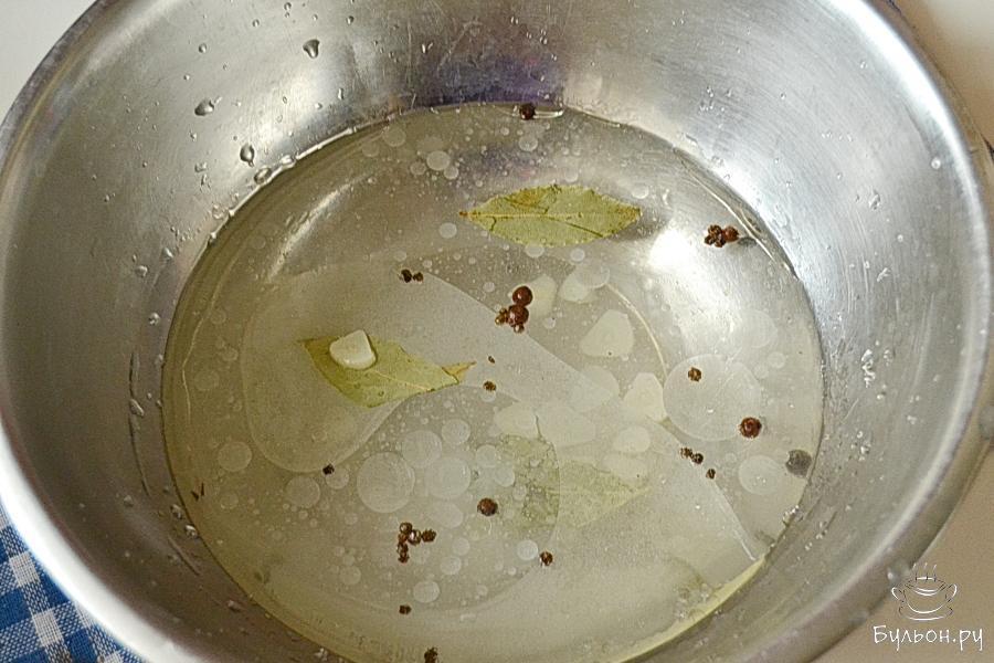 4. Приготовить маринад: в воду добавить уксус, подсолнечное масло, чеснок, нарезанный дольками, перец душистый, черный, лавровый лист, соль, сахар и уксус.