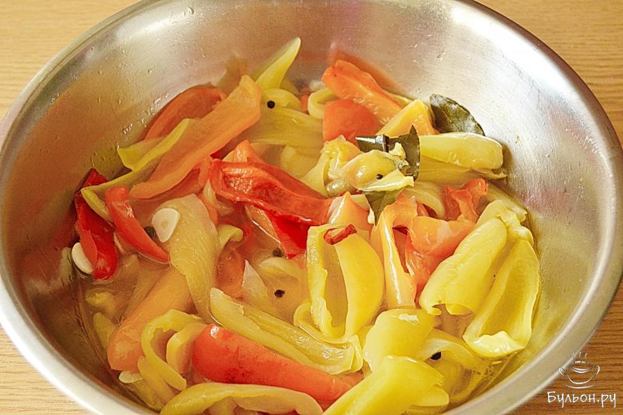 5. Нарезанный перчик сложить в маринад и поставить на огонь. Поначалу компоненты заполнят всю нашу миску.