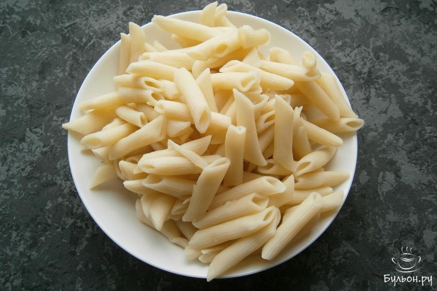 1. Предварительно нужно сварить макароны в течение 8-10 минут или, варите такое время, которое рекомендовано на упаковке, после чего их откинуть на дуршлаг.