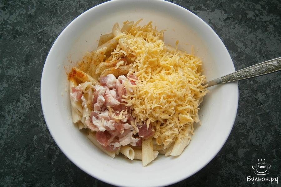 4. В полученную смесь выложить макароны, добавить приправу, перец, порезанный небольшими кусочками бекон, 2/3 тертого сыра и соль по вкусу.