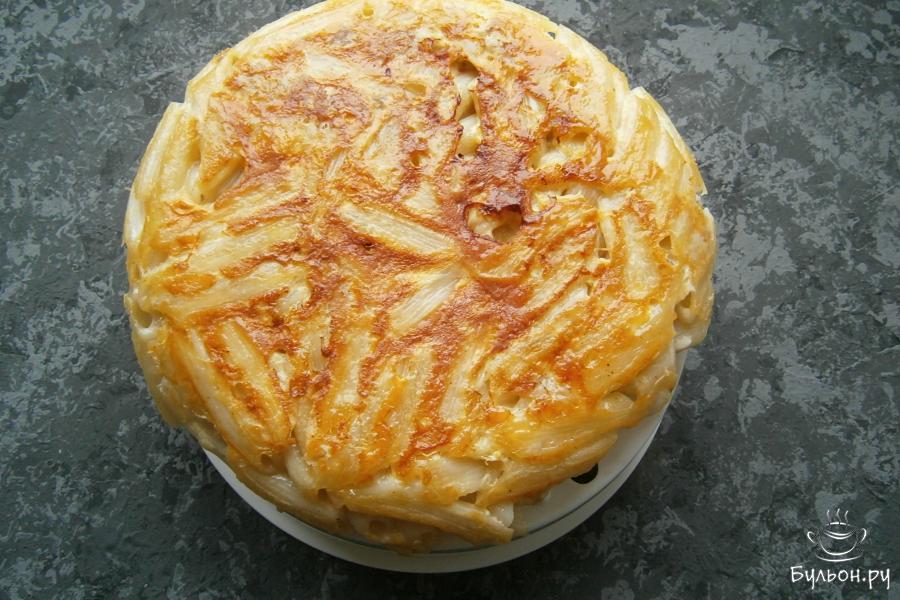 7. Готовую макаронную запеканку вынуть с помощью парового контейнера. Низ ее будет поджаренным, золотистого цвета.