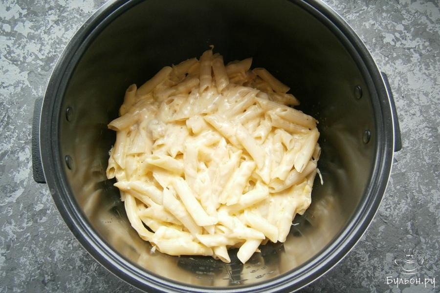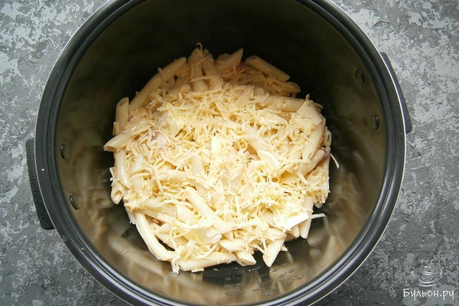 5. Все тщательно, но аккуратно перемешать. Чашу смазать небольшим количеством сливочного масла, выложить в нее макаронную смесь. Оставшееся масло кусочками разложить сверху макарон и посыпать все оставшимся тертым сыром.