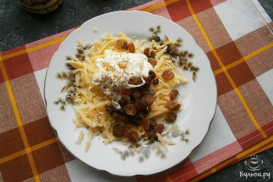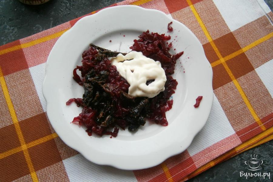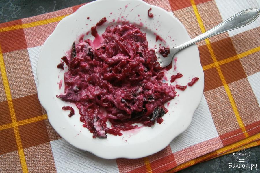 6. Свеклу натереть или порезать соломкой, добавить к ней порезанный чернослив, немного соли и оставшийся майонез.
