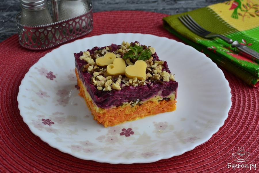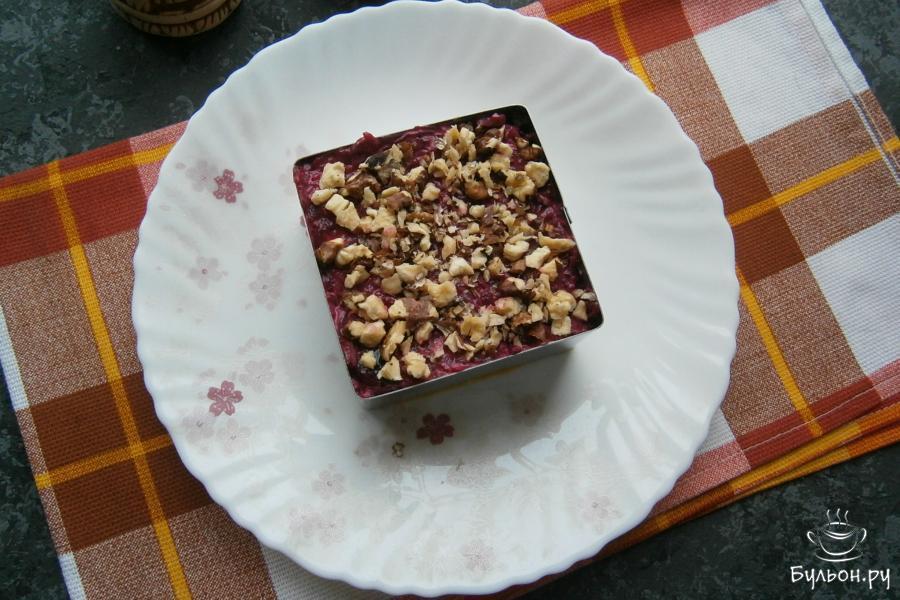 12. Убрать кольцо, дать салату пропитаться в холоде минут тридцать, украсить по своему вкусу. Приятного аппетита.