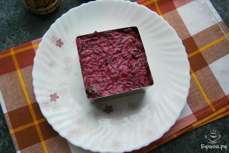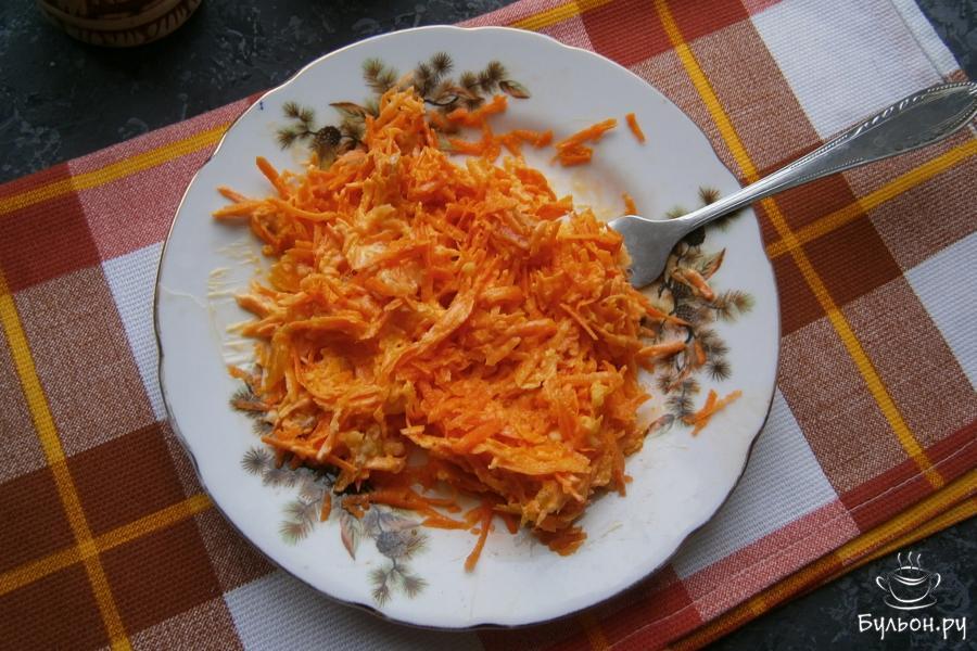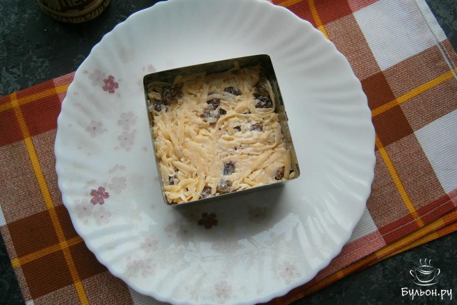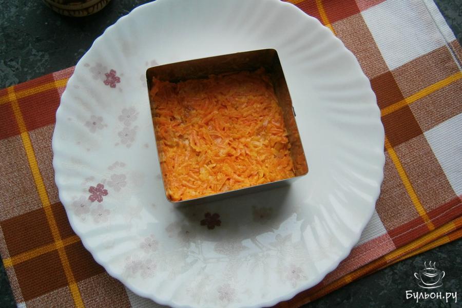 8. Теперь нужно собрать салат с помощью кулинарного кольца или выложить слои в салатник. Первым слоем будет - морковный.