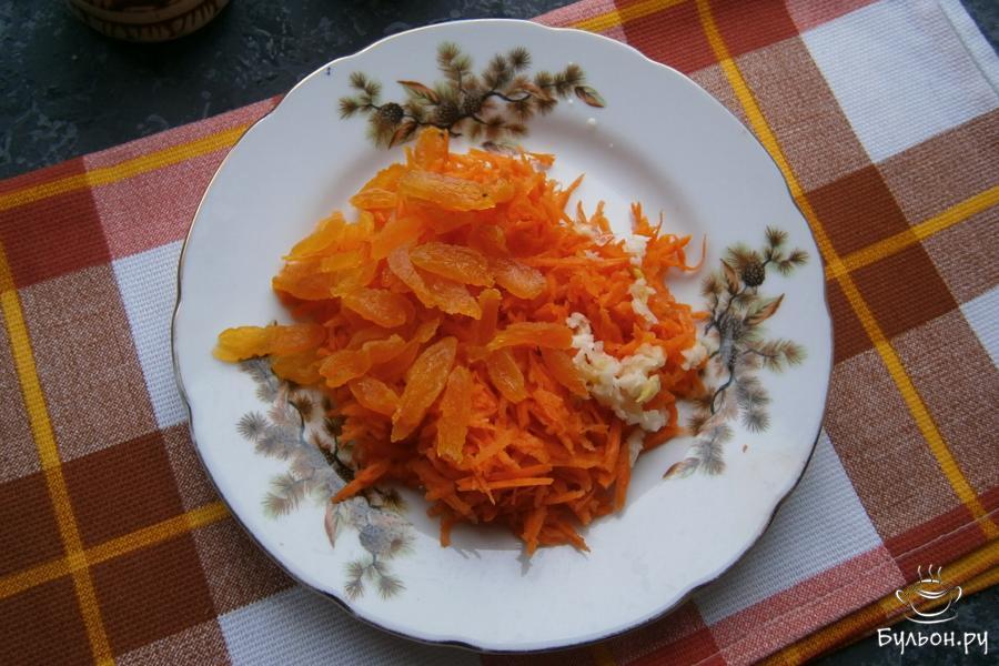 2. Морковку сырую натереть на средней терке, добавить порезанную соломкой курагу и измельченный чеснок.
