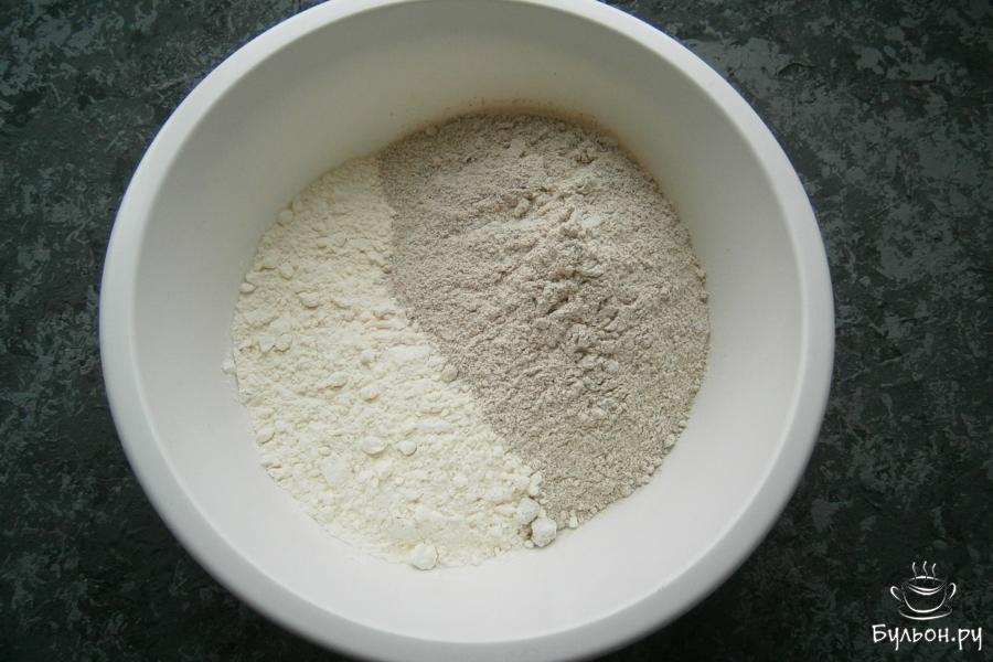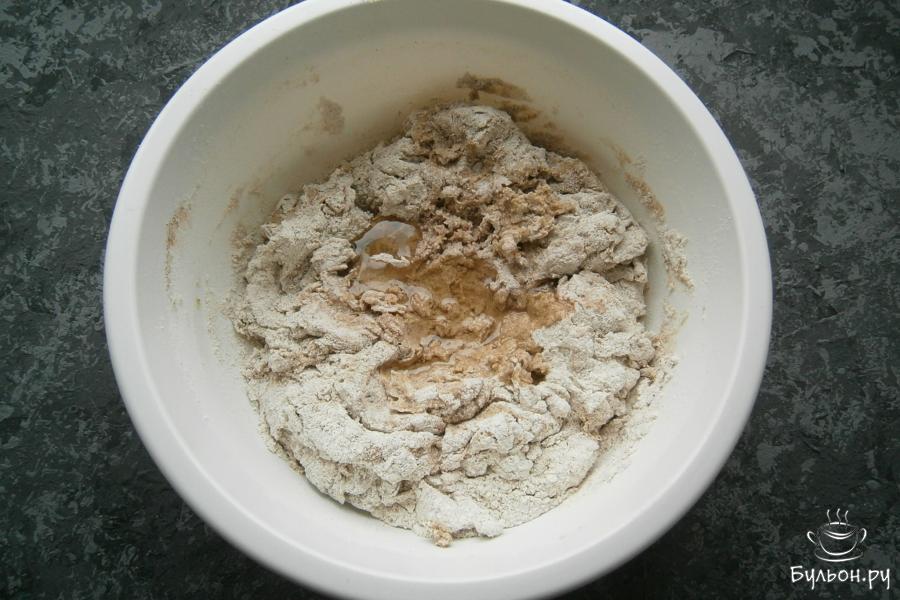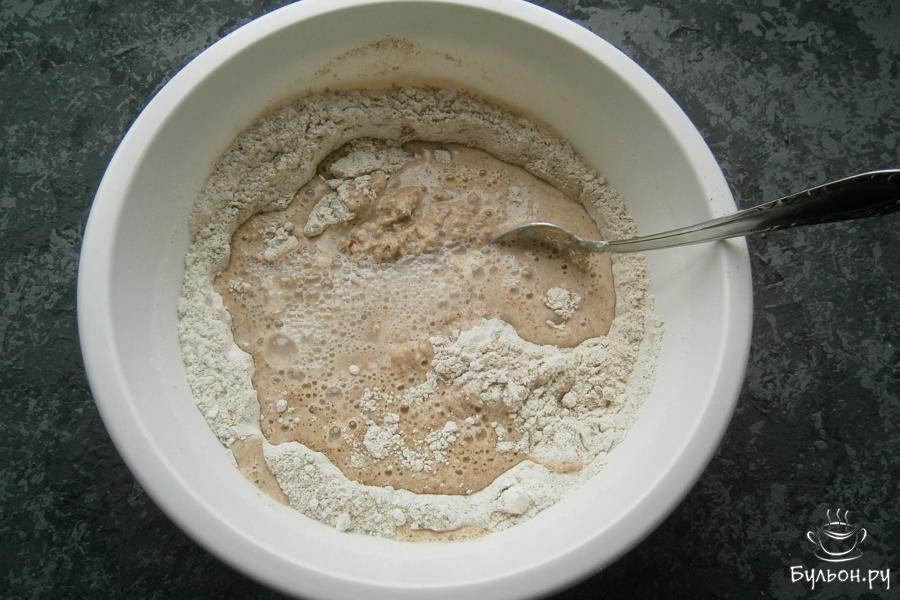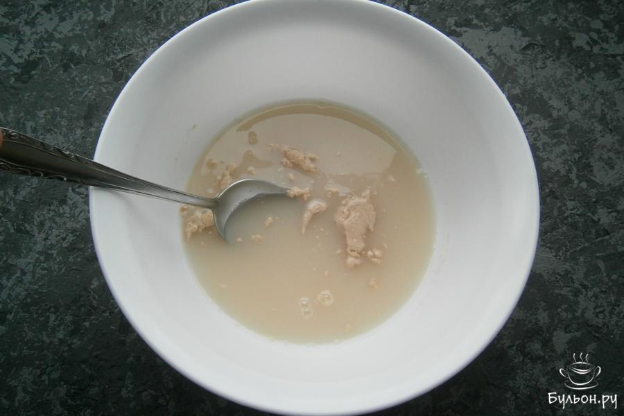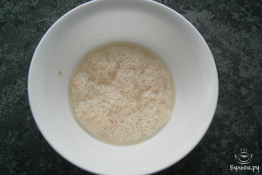 1. В миску влить воду комнатной температуры, всыпать дрожжи и сахарный песок, все перемешать, накрыть целлофаном и оставить в теплом месте на 15 мин.