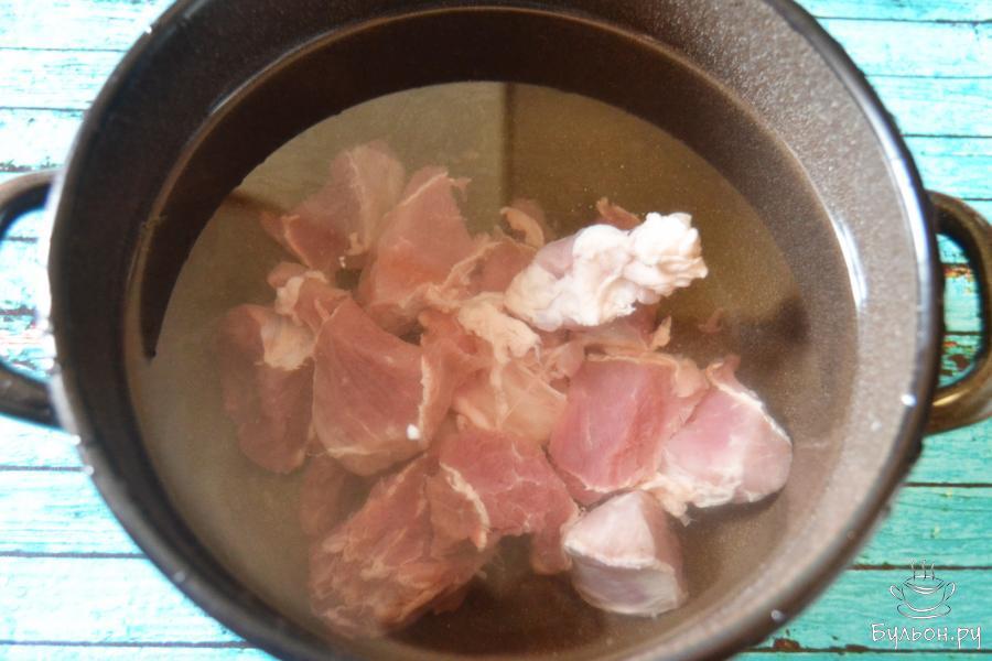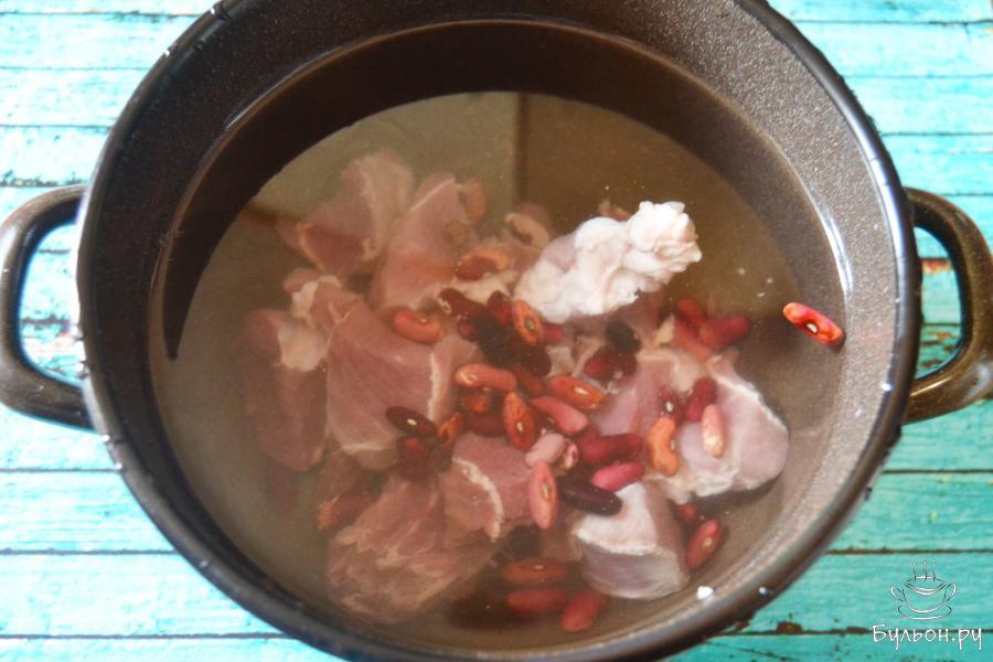 5. Одновременно добавим фасоль. Красная фасоль варится быстро, поэтому можно долго не варить. Варим фасоль вместе со свининой 40 минут. Фасоль можно сварить заранее и добавить в конце.