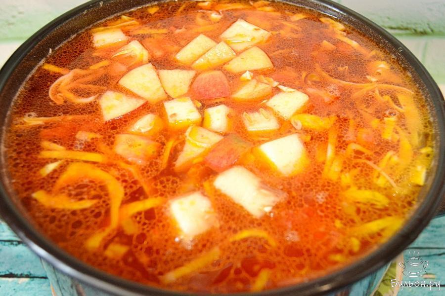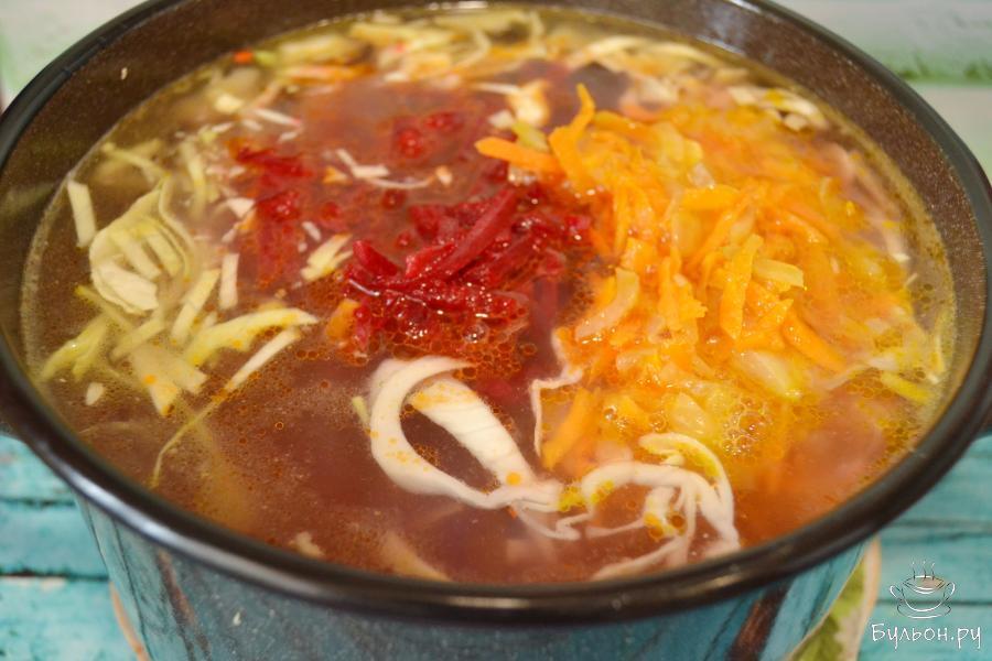 14. Далее добавим в борщ тушеную свеклу с томатом, помидор и пассеровку из моркови и лука. Поварим все вместе 10 минут.