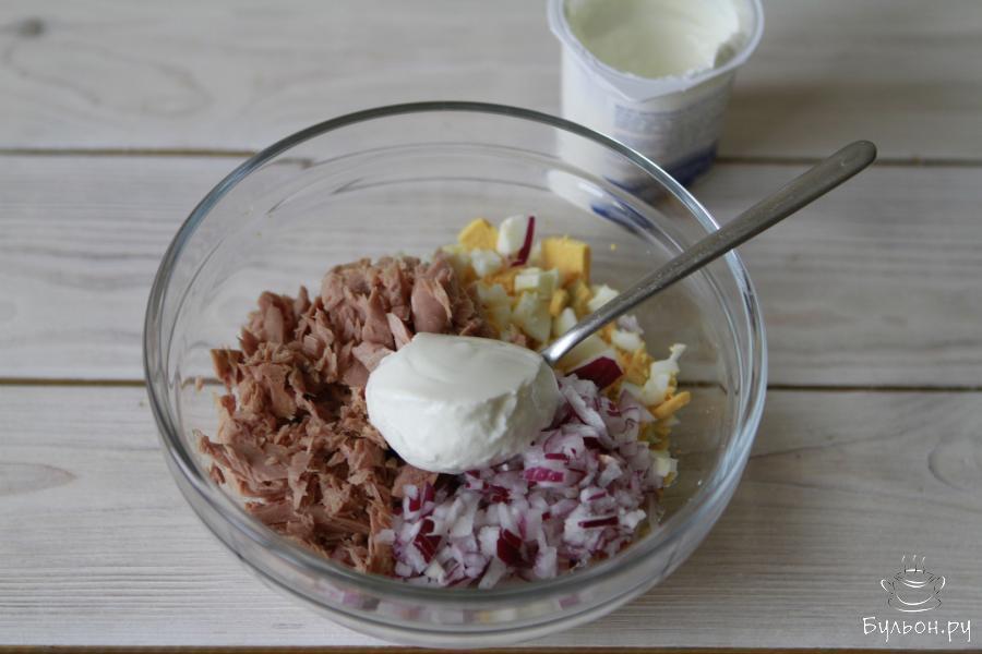 Закуска - это неотъемлемая часть любого праздничного застолья. И именно в праздник хочется приготовить что-то необычное и вкусное. Закуски из консервированного тунца пользуются популярностью. Предлагаю пополнить список таких рецептов и приготовить легкую, сытную и весьма интересную закуску. Предпочтение лучше всего отдать тунцу в собственном соку. Чтобы сократить калории, это блюдо заправляется греческим йогуртом. Специи и соль добавляются по вкусу. Готовить такую закуску лучше всего непосредственно перед подачей.