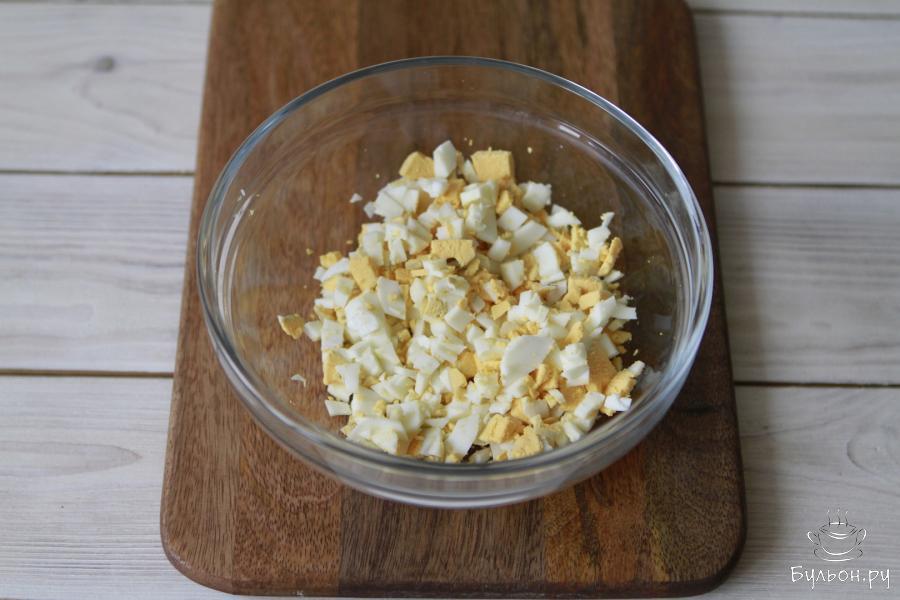 5. Соединить все ингредиенты. Заправить йогуртом. Его вполне можно заменить на сметану или майонез. Перемешать и посолить по вкусу.