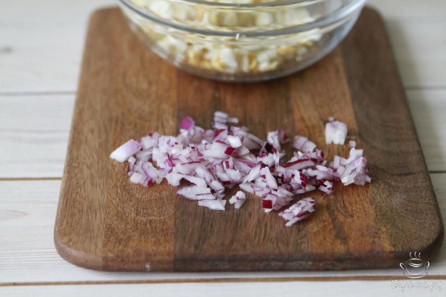 3. Сладкий красный лук почистить и нарезать на небольшие кубики. Если лук горчит, то его следует хорошо промыть.