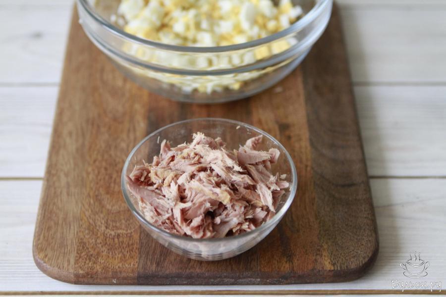 4. Тунец разделить. При использовании тунца в масле, его нужно заранее переложить ситечко, чтобы стекло все масло.